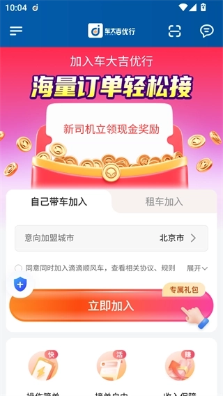 5、在首页可选择自带车辆或租赁车辆加入平台,随后即可开启接单流程。