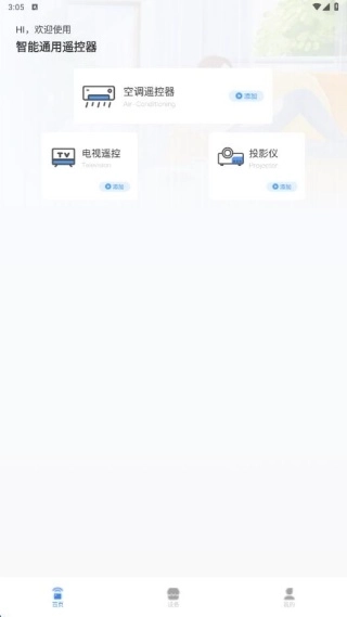 1、安装完成后进入首页,这里呈现了空调、电视、投影仪等设备的添加功能。