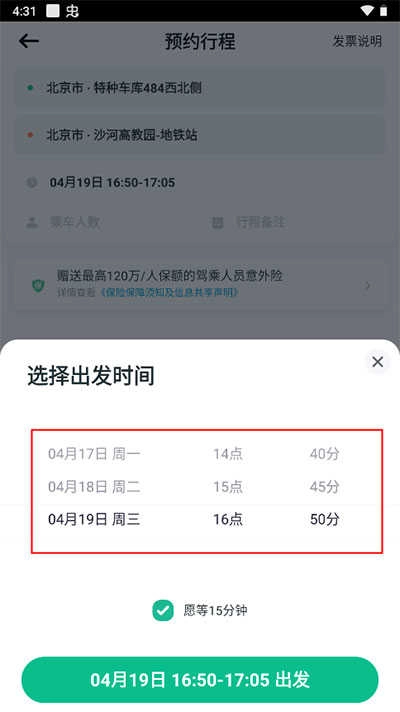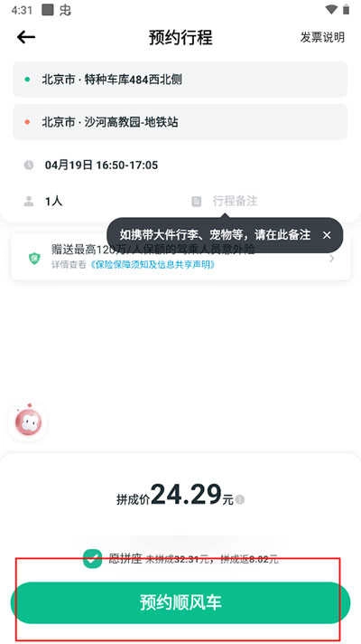 完成所有设置后,点击“预约顺风车”按钮就能发起订单。