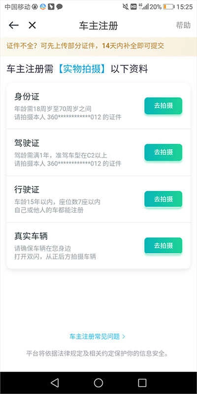 进入车主认证界面后,点击“立即注册车主”按钮即可启动申请流程。