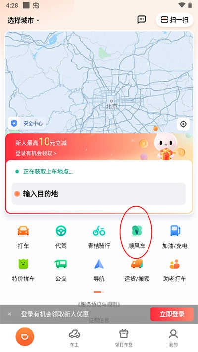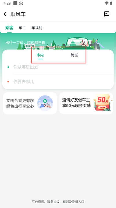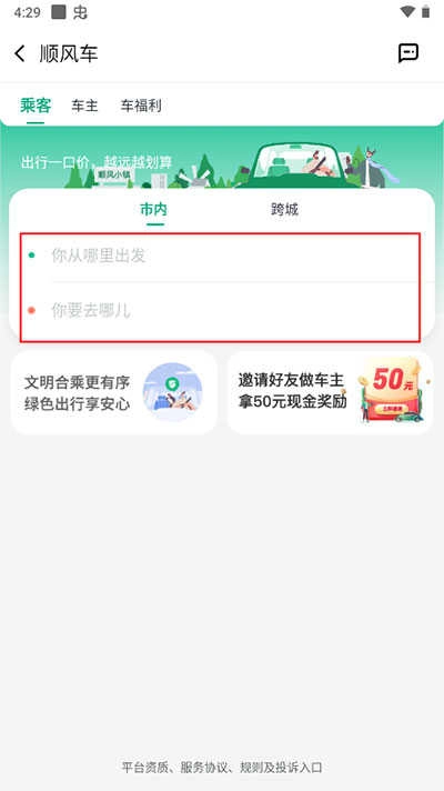 根据实际需求,选择市内顺风车或跨城顺风车,并输入出发地和目的地信息。