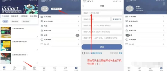 请根据提示用手机完成账号注册。注意事项:设置“密码”时,需输入6到15位由数字与英文组合而成的字符;填写“姓名”时,请务必输入真实姓名,这样便于教师进行管理。