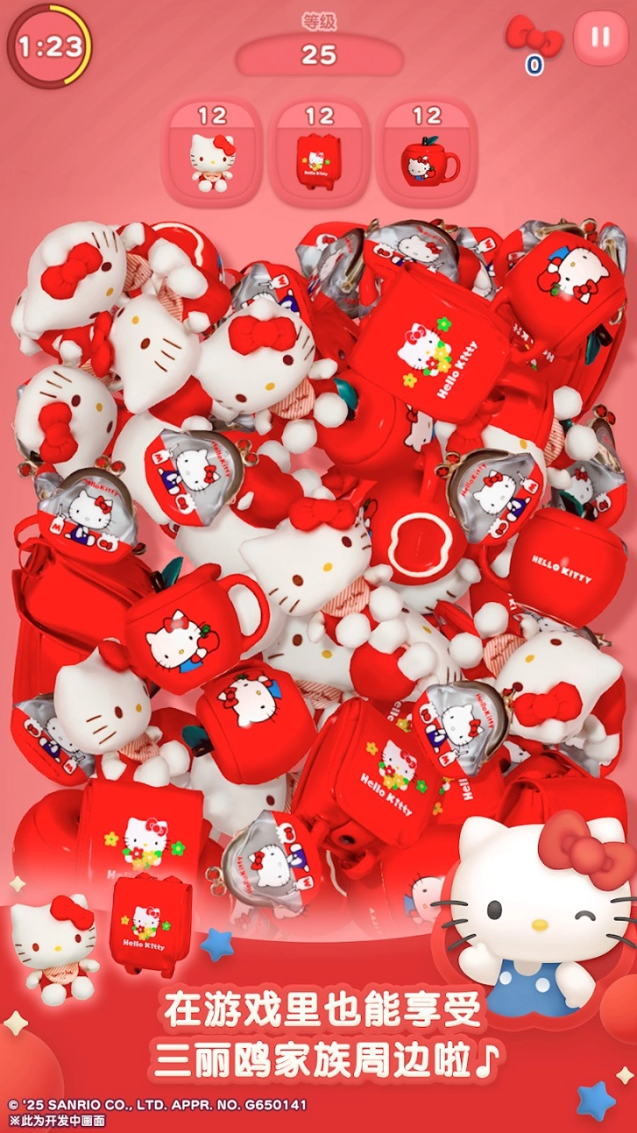 凯蒂猫集集乐是一款3D休闲益智消除游戏。玩家需要在堆积如山的三丽鸥角色周边里,找出3个相同款式的周边点击消除。游戏内有超1000种周边,既包含经典怀旧款,也有最新推出的样式,涵盖凯蒂猫、大耳狗等数十个角色的周边产品。