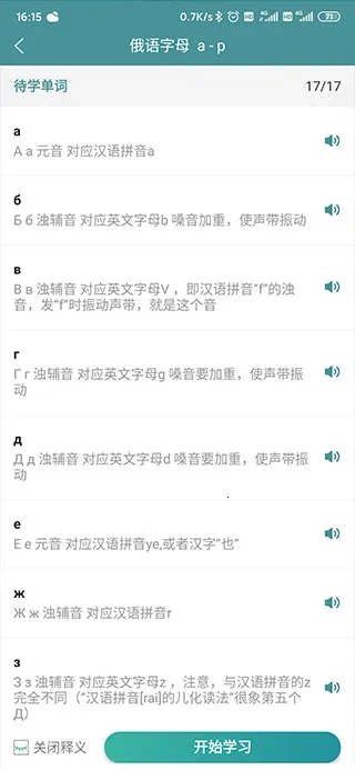 智能规划:自动安排每日的词汇学习量与课程内容,帮助你养成规律的学习习惯;2. 单词卡片:采用科学的展示形式,让你更牢固地记忆各类单词;3. 日常用语:包含丰富的日常对话范例,便于日常俄语沟通;4. 俄语读物:涵盖从初级到高级的大量文章,能够通过阅读练习熟悉俄语字母。