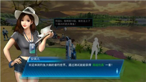 2、完成人物选择后,玩家将进入一个3D垂钓水域,有npc,npc叫“安琪儿”,根据npc的提示,完成任务将会获得一套游戏中的高级钓具。