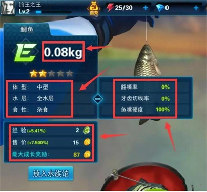 5、钓上鱼后有很多信息在这个版面显示出来,有鱼的重量、体型、水层、食性。过了任务就会有数据展示给玩家看,还有每个关卡的“排名”。