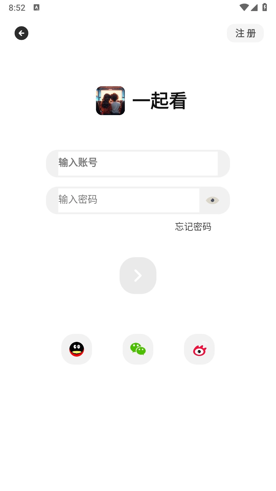 打开一起看应用,进入登录界面后,点击右上角的【注册】按钮。
