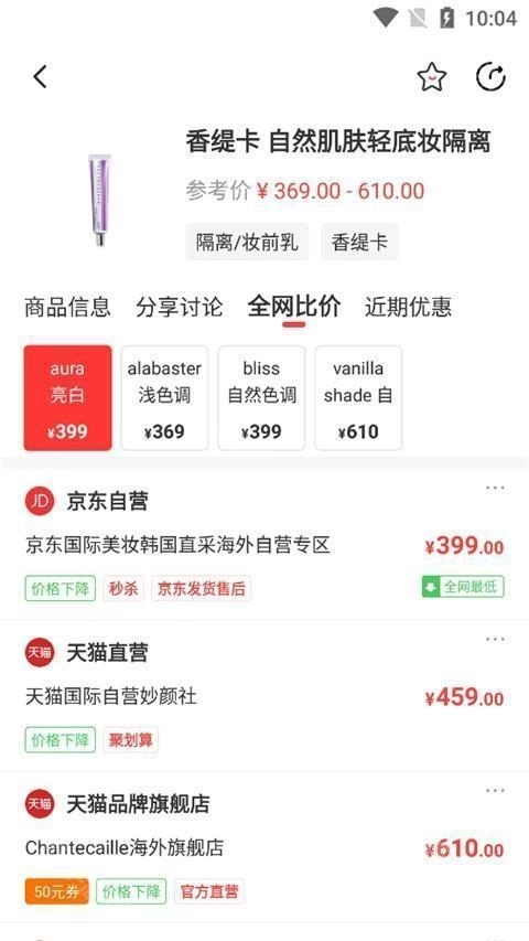 3、点击“全网比价”功能,用户即可了解同款商品在不同店铺的价格情况。