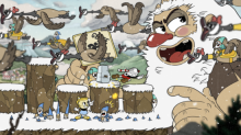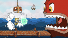 2、发射橡果,boss准备发射期间,角色向左侧移动,然后跳到最左侧的杯子上,最后再冲刺回来。