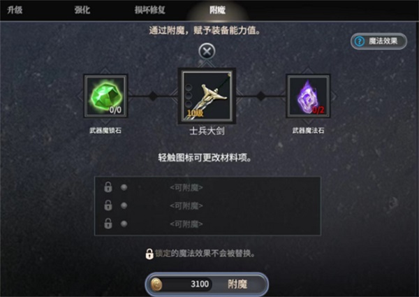 双手剑可以选择增加攻速和物理暴击率等属性的附魔。增加攻速的附魔可以提高其输出速度;而物理暴击率则是增加了暴击属性,可以带来更高的爆发伤害。
