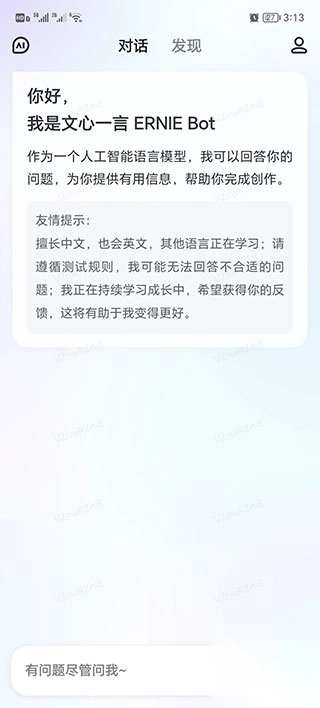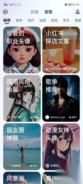 同时该app拥有对话和发现两大版块,在对话版块下,用户可以向文心一言提出任何问题,只要在它的范畴内都会给你答复;而在发现版块下,则有着很多的话题,如头像、健身助手、歌单推荐等等,用户可以根据喜好浏览阅读。