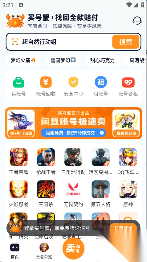 买号蟹官方最新版,是一款专业的全品类游戏交易软件。它提供热门手游、端游的账号及道具交易服务,卖家与买家能自由交易所需的道具和游戏账号。此外,软件还具备专业的代售功能,为卖家提供便利。同时,它为交易提供顶级安全保障,确保交易双方的财产安全。有账号交易需求的小伙伴不妨选择买号蟹!