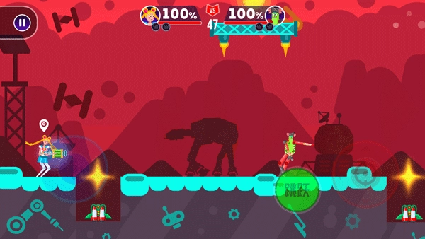 2、右侧绿色按钮控制角色跳跃,红色摇杆控制角色射击。