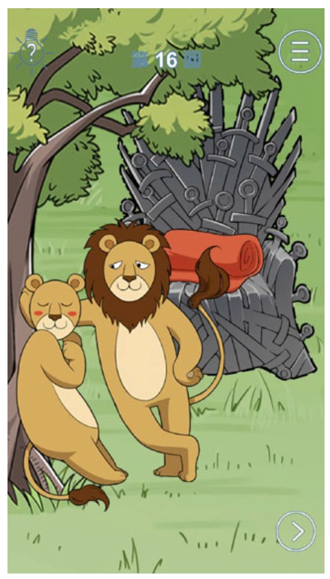 16、用四叶草对着左边的狮子吹,然后选择入座方式(可爬梯子入座,也可直接入座,还能用四叶草吹树冠后入座),接着拿王冠戴在右边狮子的头上,之后等待。