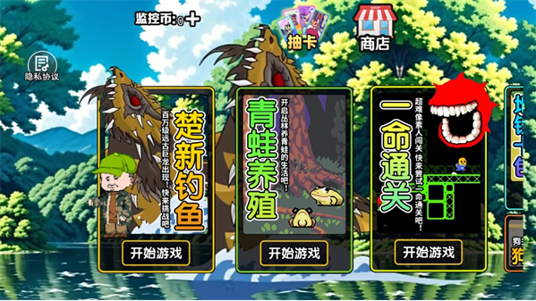2、通过里面给出的各种闯关模式:楚新钓鱼、青蛙养殖、一命通关、狗头进化、冒险模式、塔防模式、格斗模式等等来进行挑战闯关。