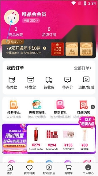 打开唯品会,轻点个人中心。