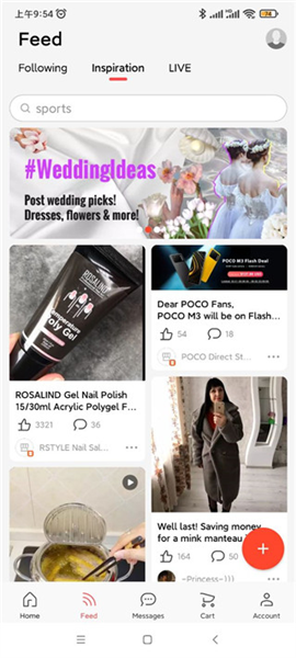 2、点开feed,由众多商品推荐,在此输入商品名称可以搜索该商品的使用体验和直播。