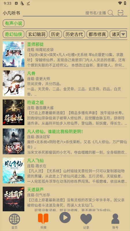 2、处于听推界面时,能够获取到极为丰富的热门有声小说作品,涵盖奇幻仙侠、玄幻脑洞、历史古代、都市修真等类型。