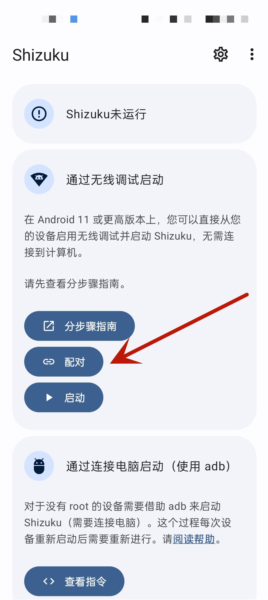 1. 先连接好WIFI,接着打开shizuku应用,然后点击进入配对选项,如果出现要求通知的提示,就点击打开。