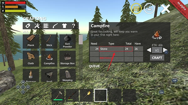 右侧显示出搭建Campfire需要24块石头。