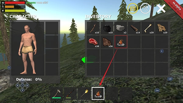 搭建好之后,能在INVENTORY里看到一个营火图标,把这个图标拖到石斧那一行的6个小格子里。