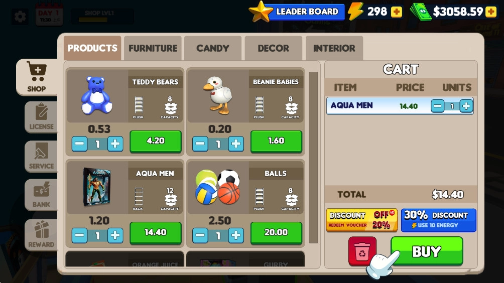 本作以经营玩法为主,你将体验到从零开始打造一个玩具超市的乐趣。你需要负责商品的进货、摆放、定价,以及店铺的装修和扩建。通过不断地努力和创新,将你的小店发展成为一个远近闻名的玩具购物中心。