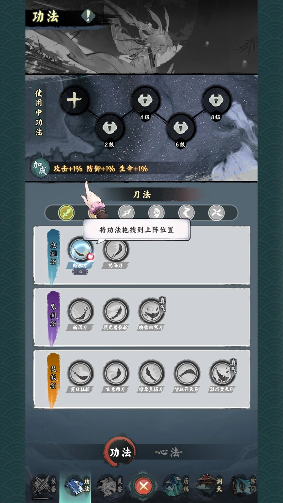 角色功法界面支持配置可使用的技能,同一系列的技能组合起来会触发特殊效果。
