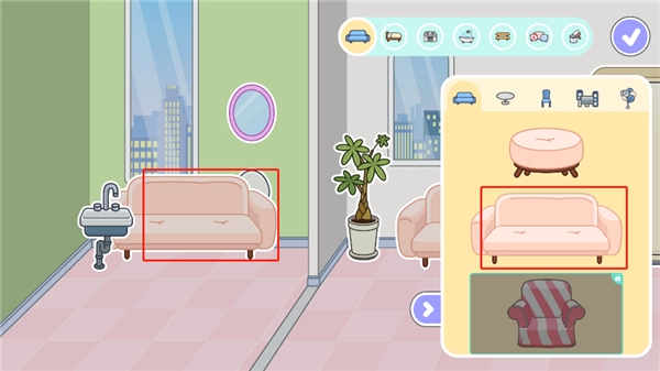 菜单里有各种各样的家居可供选择,像沙发、桌子、洗手台、床、浴缸之类的都包含在内。玩家能够依据自己的喜好,挑选心仪的家居来布置自己的房子。