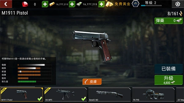 m1911手枪作为初始配备的枪械,威力表现较为逊色,射速输出处于中等水平,不过弹容量还算可观,其仅有的突出优势在于换弹速度较快,因此在游戏前期可以用于完成一些难度较低的基础任务。这款手枪对付初期出现的机械师僵尸以及流浪汉僵尸时还能应对,但面对后续出现的毒液僵尸、警察僵尸,还有举着盾牌的僵尸和头戴铁盔的僵尸时,就会显得有些力不从心,难以有效应对。