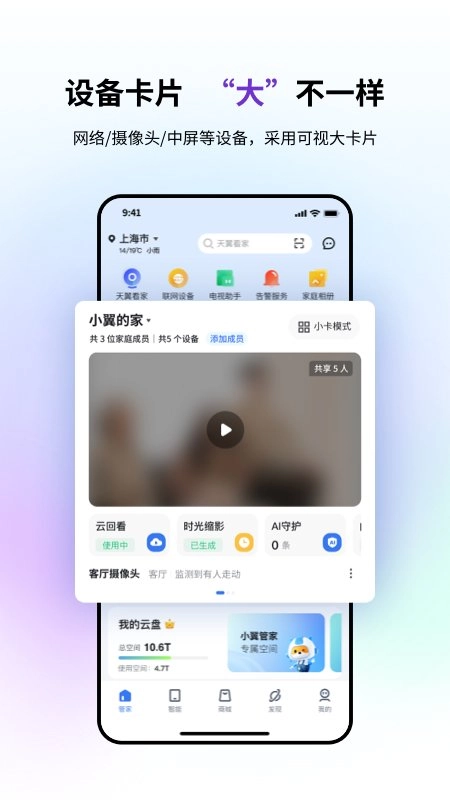 小翼管家是中国电信推出的监控摄像软件,主要为电信品牌智能设备提供便捷的在线智能控制服务,覆盖监控摄像头、路由器、视频门铃、传感器等品类。用户能随时在线操控这些设备的开关与调节,打造舒适的智能家居生活。您还可以根据需求设置生活场景,挑选合适的使用方案,一旦设备出现问题也能及时处理。