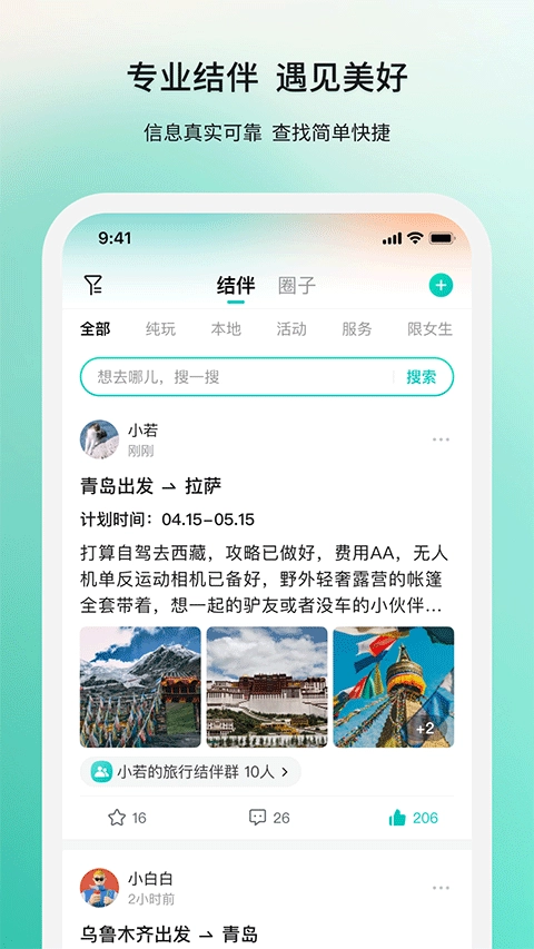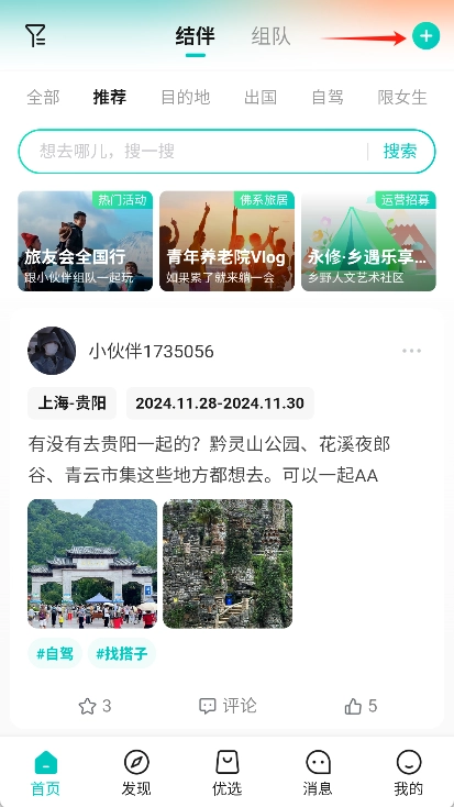 求结伴:发布结伴信息,寻找志同道合的旅伴。