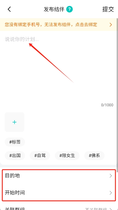 在弹出的页面中填写旅行计划的详细信息,像出发地、目的地这类内容都要包含在内。