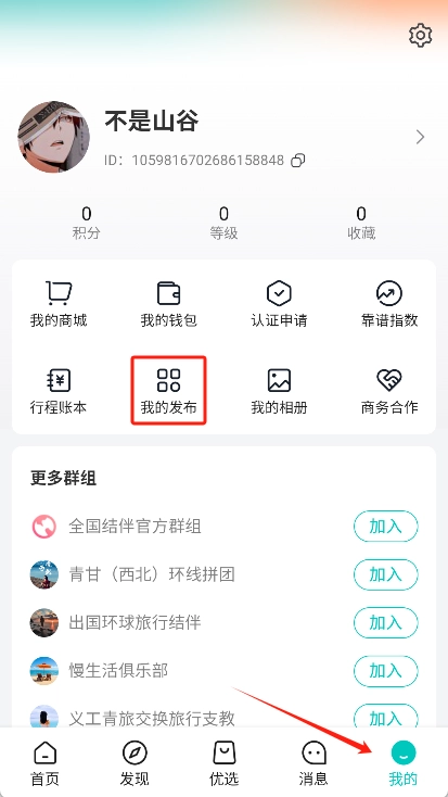 进入“我的”页面后,点击“我的发布”选项,即可查看并管理自己已经发布过的旅行计划。