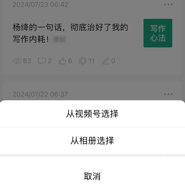 可以选择“从视频号选择”或者“从相册选择”,把你打算发布的视频内容上传上去。