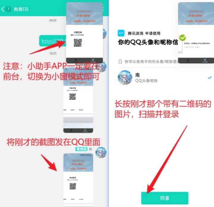 请不要离开当前页面,建议先截图保存二维码,接着把小助手切换成小窗模式悬浮在屏幕上,之后再把二维码发送到QQ或微信。温馨提示:QQ用户可以长按二维码登录,也能选择密码登录;微信则只能扫码登录,这需要使用两个手机,或者把小助手安装在电脑的安卓虚拟机里操作。