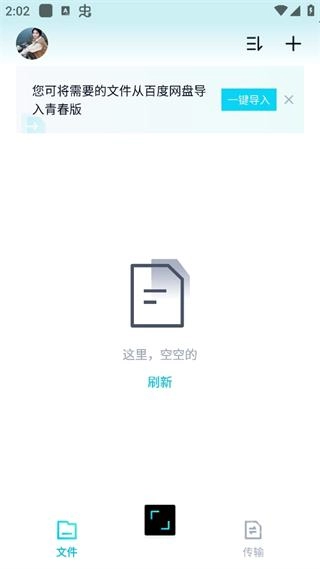 用户打开百度网盘青春版后,点击顶部的“一键导入”按钮就能完成文件导入操作。
