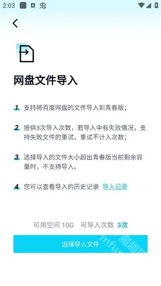 当用户点击下方的“选择导入文件”选项时,请注意青春版仅有3次导入文件的机会。