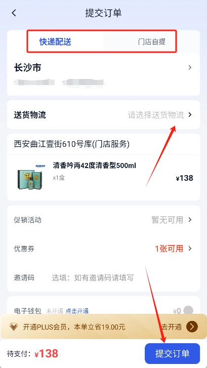 在结算页面,您可以选择“门店自提”或“快递配送”这两种方式,选好后提交订单即可完成下单流程。