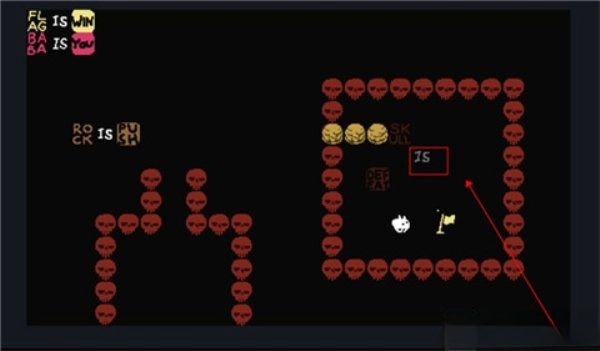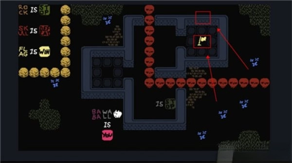 2、之后你会发现这个“规则”衍生出了各种不同形式,像双层地图、用箱子填补坑洞、单纯开辟出通路等都属于此类;而场景里“baba is you”“rock is push”“flag is win”这类句子,实际上就是对应关卡的规则设定。