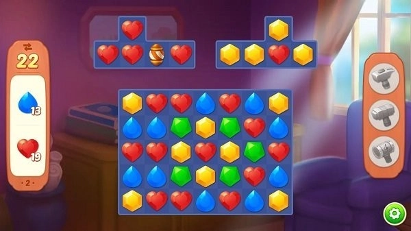 《宝石梦想家》是一款卡通风休闲模拟小游戏,融合了当下热门的消除与模拟建造玩法,非常适合休闲放松。游戏操作简单,玩家通过不断完成消除关卡获取实用道具,助力主角完成房间建造。