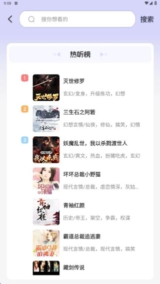 2、结合搜索功能,快速查找你感兴趣的听书资源。