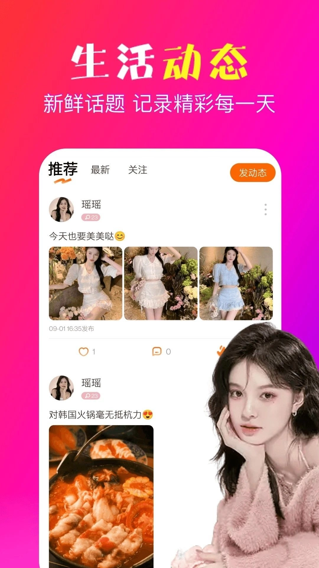 1、支持动态自由分享,用户能够在动态广场记录真实生活、分享日常点滴,还能和他人互动交流。
