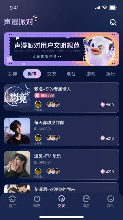 声漫派对是一款超赞的手机社交应用,能让你畅快地聊天互动。它拥有多种多样有趣的聊天方式,比如语音、文字等,想怎么聊就怎么聊。你可以根据自己的喜好和不同的场景,选择合适的沟通形式,让社交变得非常有趣,特别贴合咱们年轻人的社交习惯。在这里,你能快速找到自己心仪的那个ta,帮助你更快脱单,找到合适的恋爱对象哦。