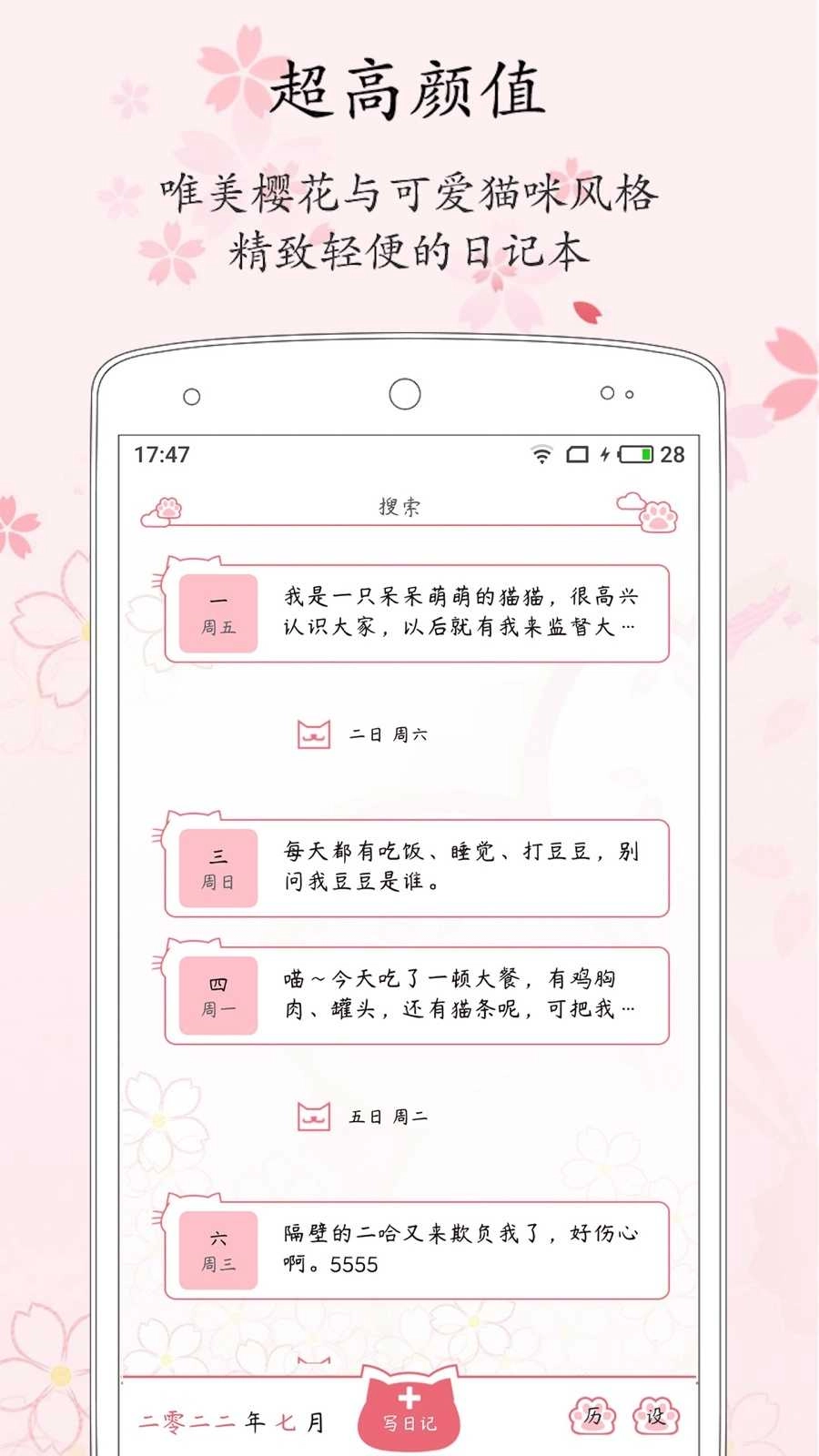 粉萌日记是一款十分潮流的日记应用,它功能丰富且齐全,日记、笔记、便签、日程、计划等各类功能应有尽有,并且全部都能免费使用。此外,它还支持指纹解锁和隐私密码功能,能很好地保护用户的个人隐私。感兴趣的小伙伴们,快来体验吧!