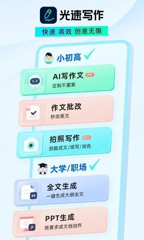 光速写作是一款助力文章创作的辅助软件,搭载AI智能写作功能:既能为你的作文做恰当修改,让文章更显润色效果;也能依据你的需求描述直接生成完整文章,实现高级定制且内容不重复。平台还收录了海量优质范文,可供随时浏览学习;若想了解自己文章的水平,还能通过AI批改功能,获取各维度的数据分析与针对性建议,帮助你提升写作能力。