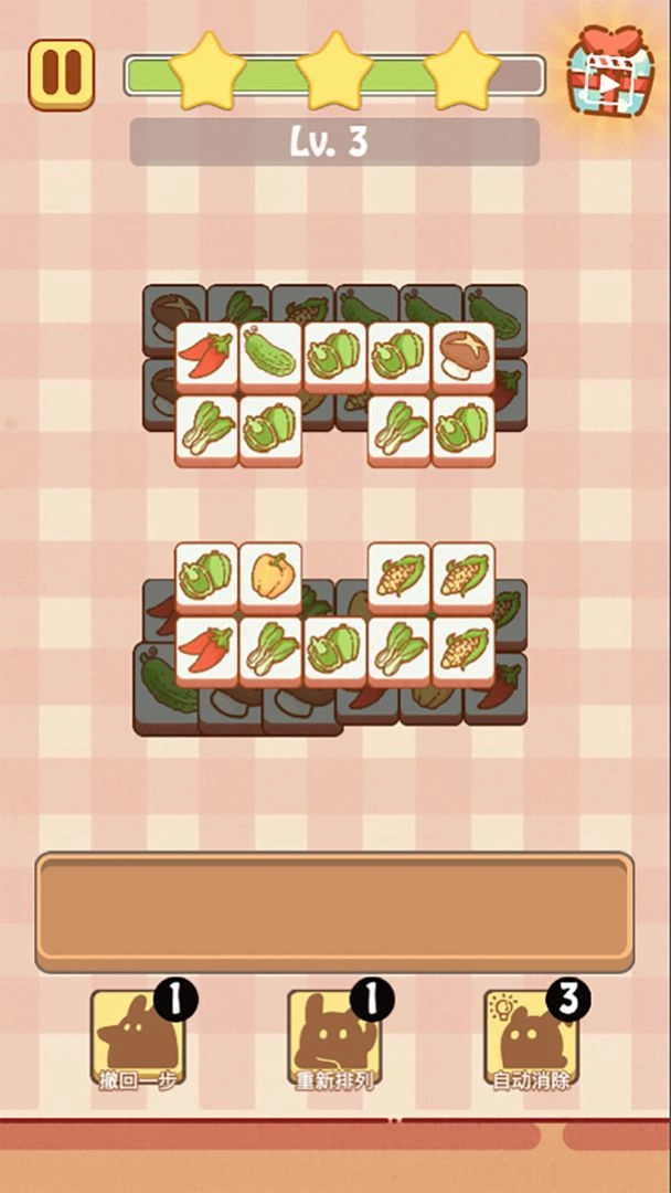 游戏遵循经典三消规则:通过滑动屏幕交换相邻的食物图标(胡萝卜、卷心菜、草莓等),使3个及以上相同图标连成横排或竖排即可消除。进阶操作中,4个同图标消除可生成“直线消除道具”,点击后消除整行或整列的图标;5个同图标形成L形或T形消除可获得“爆炸道具”,触发后清除周围3×3范围内的图标;5个同图标连成直线消除会生成“彩虹道具”,与任意图标交换可消除全场所有相同类型的图标。实战中,优先消除下方或中间区域的图标,避免上方图标堆积形成“死局”;遇到多层图标时,先消除上层图标,再处理下层,逐步打通消除路径。