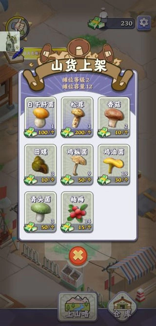 4、模拟经营玩法,玩家可以借助山货买卖的方式赚取更多资金,以此来拓展经营规模、升级店铺。