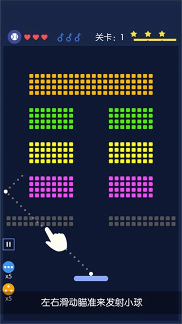 2、通过左右滑动屏幕进行瞄准,以此来发射小球,需要注意的是要从灰色砖块之间的空隙将小球发射出去。