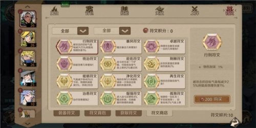 玩家在等级达到10级时将解锁符文系统,该系统的符文可通过任务奖励获取或使用金币抽取,并且每天拥有一次免费抽取机会。符文总共分为攻击、防御、生存、辅助四大类别,玩家可利用分解符文得到的符文碎片,将符文升级至5级。符文依据等级划分为1星到6星,其中6星符文的强度最高。随着玩家等级的提升,会逐步解锁对应的符文框,只有开启符文框后,玩家才能在其中装备符文。