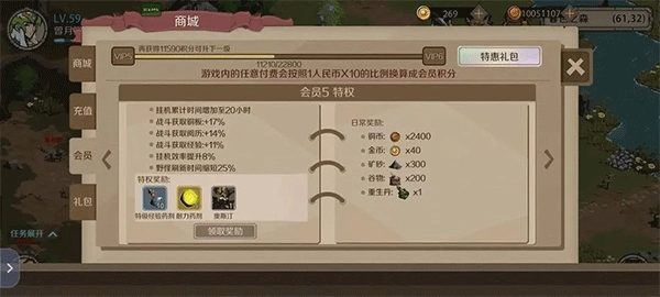 嘿嘿,充值的具体情况这里就不细说了,游戏内都能看到。总之VIP等级越高,对应的特权就越丰厚。另外要提一句,不管是哪种充值都会算进VIP等级积分里,所以购买各类礼包是最划算的选择。